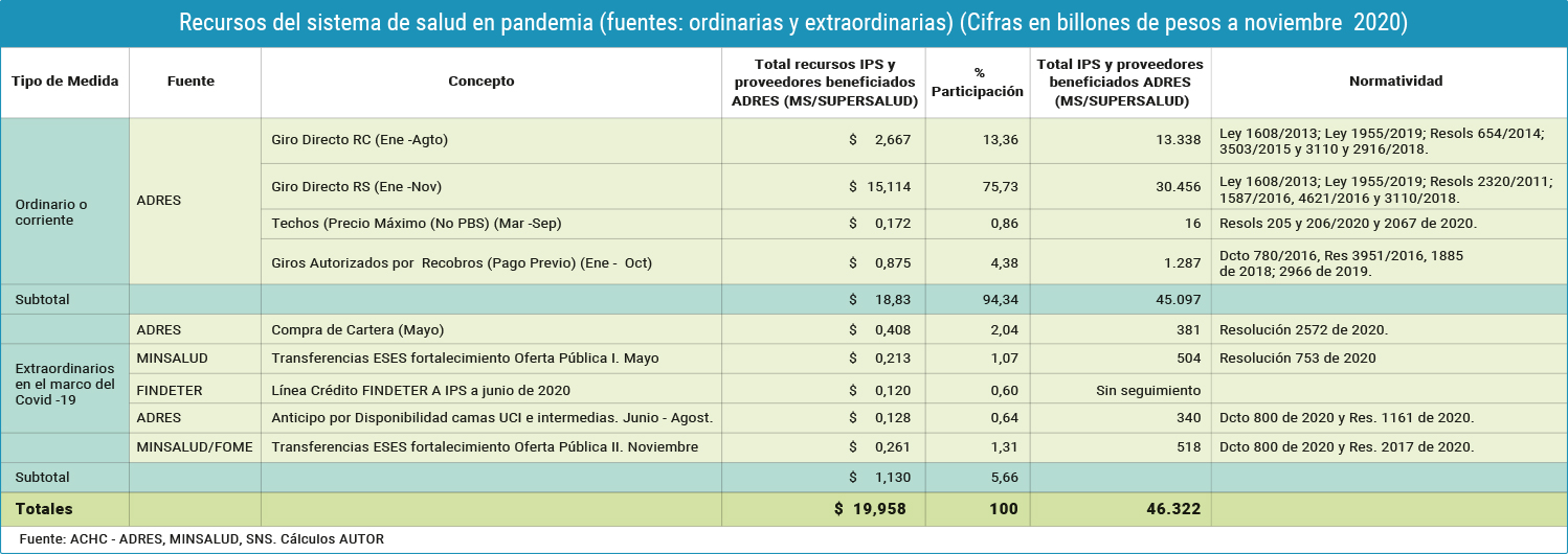 Los recursos extraordinarios, a igual fecha de corte, fueron de $1.13 billones, representando el 5.66% del total de los recursos dispuestos en toda la vigencia fiscal de 2020 hasta el mes de octubre, siendo las mayores beneficiarias 46.322 IPS, contabilizado el número de veces que se le realizó giro a una misma IPS. Lo anterior ha permitido darle dinámica al sector al fondear organizaciones de las que generalmente dependen proveedores de insumos, dispositivos, materiales médicos, quirúrgicos, de odontología, tecnologías en salud y similares.