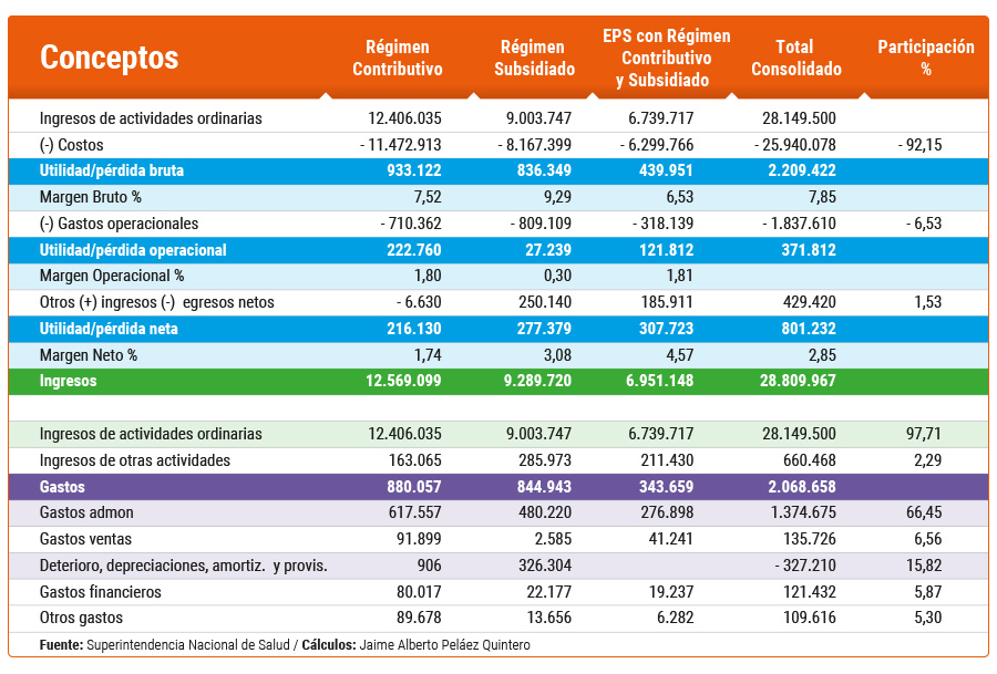 Con ingresos operacionales de $28.1 billones y costos de producción (léase facturación de prestadores), de $25.9 billones, la utilidad bruta fue de $2.2 billones, para un margen absolutamente significativo de 7.85%, es decir, por cada $100 de ingreso operacional, a las aseguradoras en conjunto les quedó $7.85 para cubrir gastos operacionales, otros gastos, financieros y de provisión de impuestos, porcentaje que no se registraba desde los principios del aseguramiento.