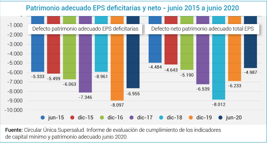 A junio de 2020, las necesidades de inyección capital o defecto patrimonial, que aunque mejoraron ostensiblemente por las razones ya expresadas, son de $7 billones en las 22 EPS con reporte deficitarias, no obstante que el valor neto fue de -$5 billones, siendo de -$1.2 billones las 5 EPS del régimen contributivo (17.05%), con Coomeva a la cabeza con -$659 mil millones, seguida de SOS -$390 mil millones y Famisanar -$130 mil millones.