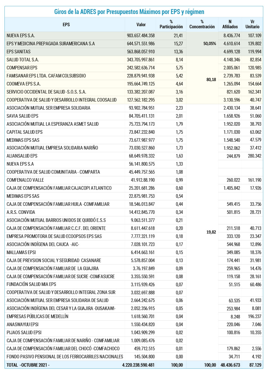 Solo en 2021 el valor girado a EPS hasta octubre fue de $4.2 billones, y de acá tres EPS concentran el 50 % del total de los recursos: Nueva EPS con $903.657 millones y una participación del 21.41 % (más de la quinta parte del total), SURA EPS y Medicina Prepagada Suramericana con $644.572 millones (15.27 %) y EPS Sanitas con $563.868 millones, 13.36 %.
