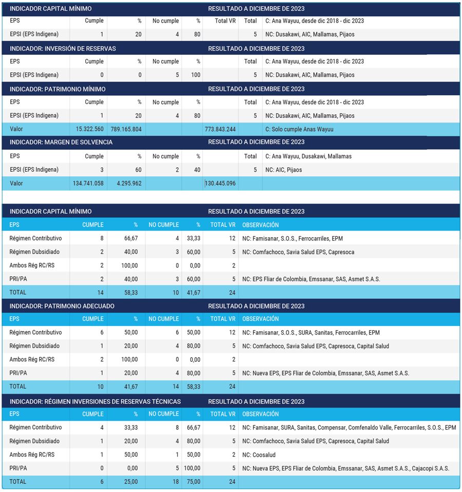 El indicador más relevante en el aseguramiento en salud en Colombia, que evalúa la capacidad financiera y patrimonial del sistema, es el Patrimonio Adecuado. Este indicador se calcula inicialmente aplicando un porcentaje (8 % o posiblemente 6 %) a los ingresos operativos de los últimos 12 meses para determinar la suma del capital primario y secundario, conocida como Patrimonio Técnico. Idealmente, el Patrimonio Técnico debería superar siempre al Patrimonio Adecuado.