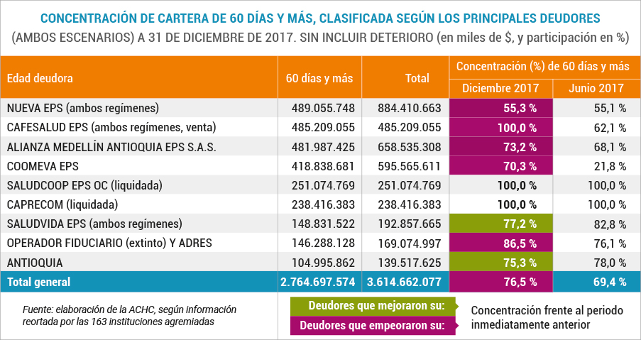 Por el lado de las EPS públicas en operación, el estudio de la ACHC señala a Convida como la que tiene una mayor deuda con un monto total de $ 101.044 millones y una concentración de cartera morosa del 62,8 % a diciembre de 2017.