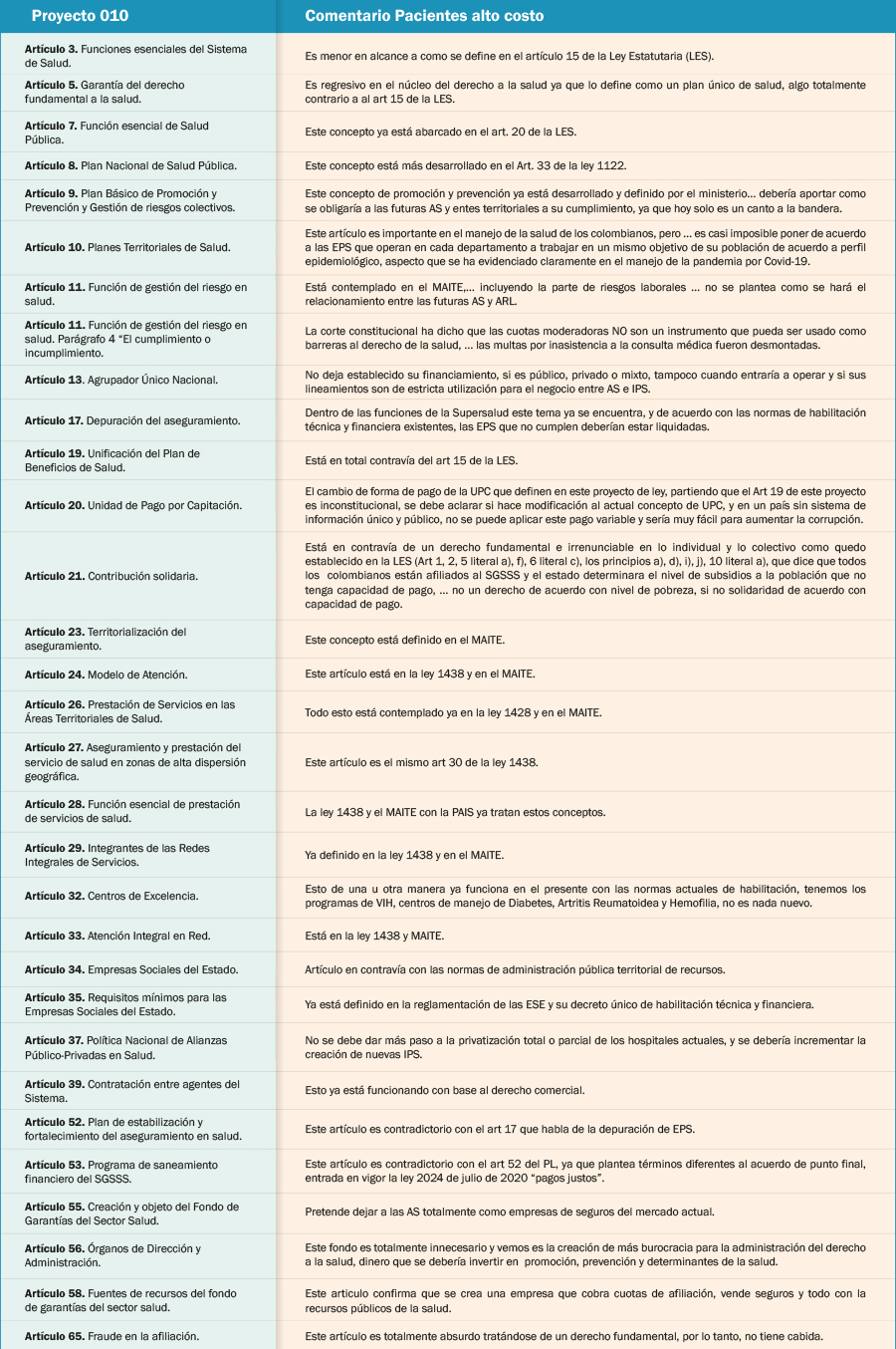 Algunas de las objeciones presentadas al Congreso de la República por la Asociación de Pacientes de Alto Costo coinciden con otras señaladas por diversos actores, como la presentación de nuevos artículos que ya se encuentran consignados en otras leyes, por ejemplo. Algunas de las observaciones en la siguiente tabla: