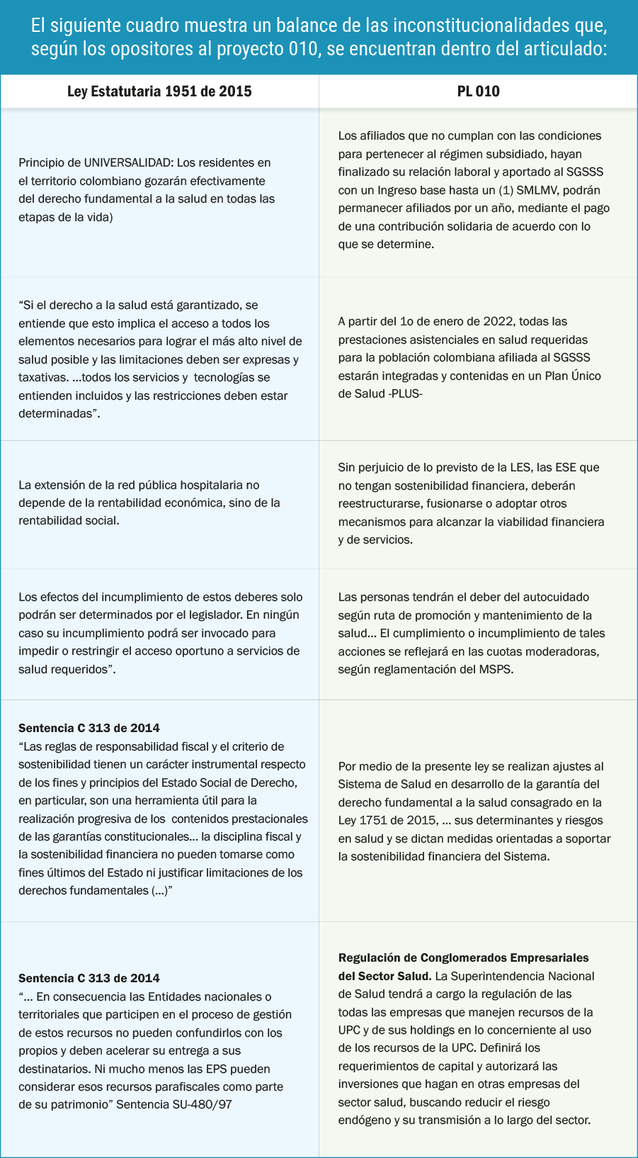 Para el doctor Luis Alberto Martínez Saldarriaga, director ejecutivo de la Asociación de Empresas Sociales del Estado de Antioquia, AESA, el 010 generaba más obstáculos a la garantía del derecho fundamental a la salud, además de tener elementos inconstitucionales e inconvenientes. “Se trata de vender la idea que el SGSSS es parte del sistema de salud y que así se cumplen los mandatos de la ley estatutaria la 1751 que le dan una categoría superior a la salud y la elevan a derecho humano fundamental. Pero en realidad es inconstitucional, inconveniente y lleno de contradicciones”.