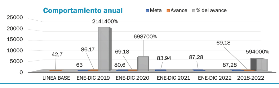 En lo que va del cuatrienio del actual gobierno, el indicador ha tenido un avance del 59,40%. En contraste, se destaca que, el valor del nivel agregado de gestión hospitalaria en el país al cierre de junio de 2018 alcanzó el 42,7% y para diciembre de 2019 tuvo un avance del 86,17% sobre la meta del 63% lo que corresponde a un porcentaje del avance del 214,14%. La meta para el 2020 es de 80,60 con un avance del 69,18%. Hasta la fecha esto corresponde a un porcentaje de avance del 69,87%.