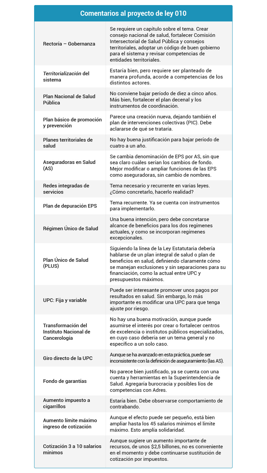 Entre los temas relevantes que toca el proyecto en discusión, y que ciertamente recogen preocupaciones aún no resueltas en el país y que contribuirían a mejorar el desempeño del sistema, se encuentran: el desarrollo de un modelo de atención en salud que responda a las expectativas y necesidades de la población, mediante la atención primaria en salud y la adscripción a un médico de familia o comunidad; la búsqueda de nuevos recursos para el sistema, vía una nueva modificación en los impuestos al tabaco y el retorno de los 8,5 puntos de la cotización para el caso de las empresas con trabajadores cuya remuneración sea entre tres y diez salarios mínimos, y una mayor integración del sistema con los regímenes de excepción y las administradoras de riesgos laborales.