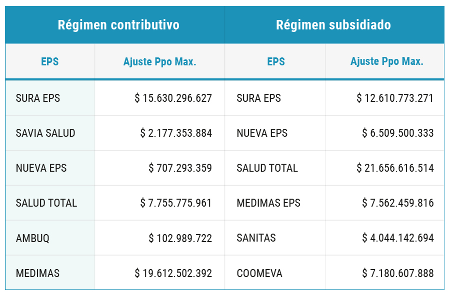 Luego de los análisis respectivos, el Ministerio de Salud aprobó ajustar los valores definidos como presupuestos máximos de algunas EPS del país. En el acto administrativo se consignan los montos a girar y que corresponden a la vigencia de 2020. La decisión se tomó con base en la información suministrada por la Comisión asesora de beneficios, costos, tarifas y condiciones de operación del aseguramiento en salud, que recomendó un ajuste de los presupuestos para las EPS que mostraban riesgo de superación del presupuesto. Algunos de los principales ajustes fueron asignados de la siguiente manera: