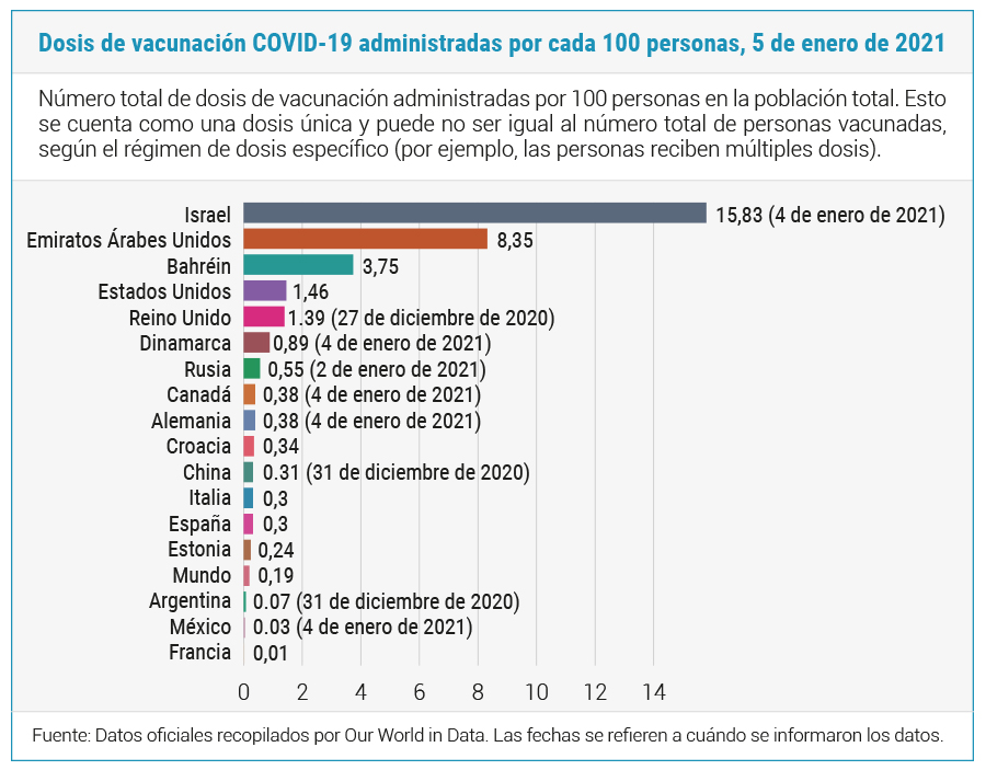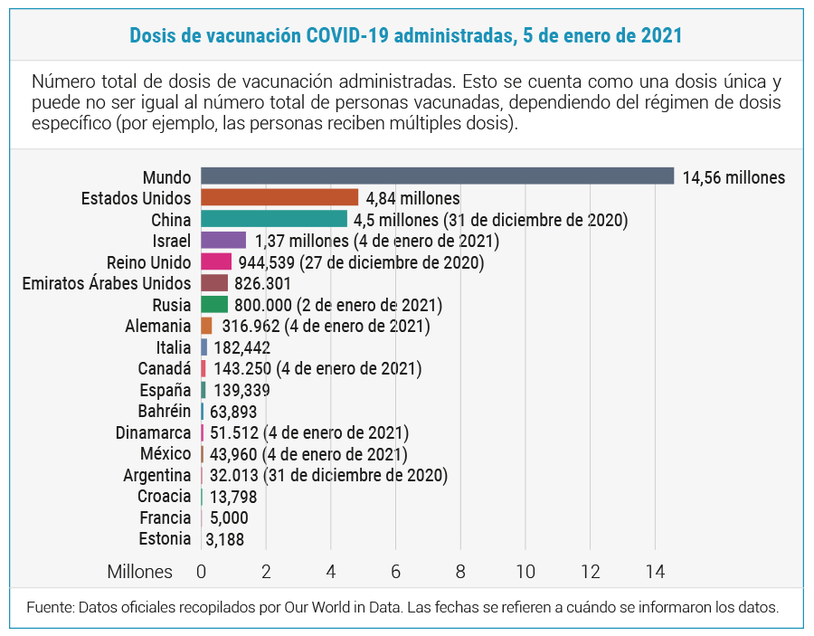 Con corte al 4 de enero, en el mundo se han aplicado 12.62 millones de dosis, siendo China el país con una mayor cantidad, 4.5 millones, seguido de Estados Unidos con 4.23 millones, e Israel con 1.22 millones. Argentina lidera el proceso de América Latina con 32.013 dosis aplicadas seguida de México que al 31 de diciembre llevaba 24.998.