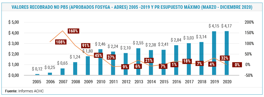 En el gráfico se observan cuatro momentos de verdad alineados con decisiones jurisdiccionales y de alto gobierno. El primer momento se caracteriza por un incipiente crecimiento que no alcanza al billón de pesos entre los años 2005 a 2007. Una vez se expidió la Sentencia T-760 de 2008 se configura un segundo momento de crecimiento que va hasta el año 2018 con incrementos que superan el aumento del salario mínimo y la misma inflación, y que desencadenaría un fenómeno de insolvencia al presentar valores que oscilaron entre $1 y $3 billones. Un tercer momento en la cronología está en el año 2018-2019 con un crecimiento notorio del 32 %, que converge con la entrada en pleno de la Ley Estatutaria en Salud. Para 2020, se mantiene el mismo valor en términos absolutos y por tanto corrientes.