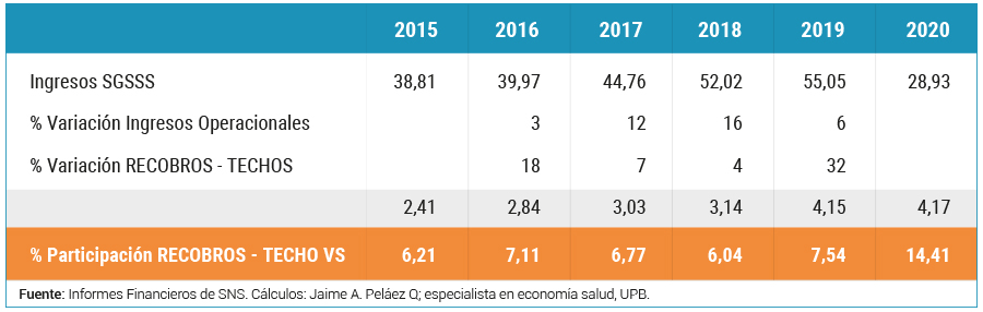 En la vigencia fiscal de 2016 la variación de los ingresos operacionales fue del 3 %, los recursos en ese mismo año crecieron para actividades de recobro en dos dígitos, hasta el 18 %, mientras en 2019 dicho crecimiento fue del doble en ingresos operacionales con 6 %, al igual que la variación de recobros - techos máximos y que casi se duplicó frente a este mismo año, es decir que el sistema cada vez recibe una presión más fuerte en la utilización y aplicación de nuevos recursos para financiar las acciones por fuera de los planes básicos en salud. Este comportamiento es un tanto contrario en los años 2017 y 2018 con variaciones de 12 % y 7 % y 16 % y 4 % respectivamente.