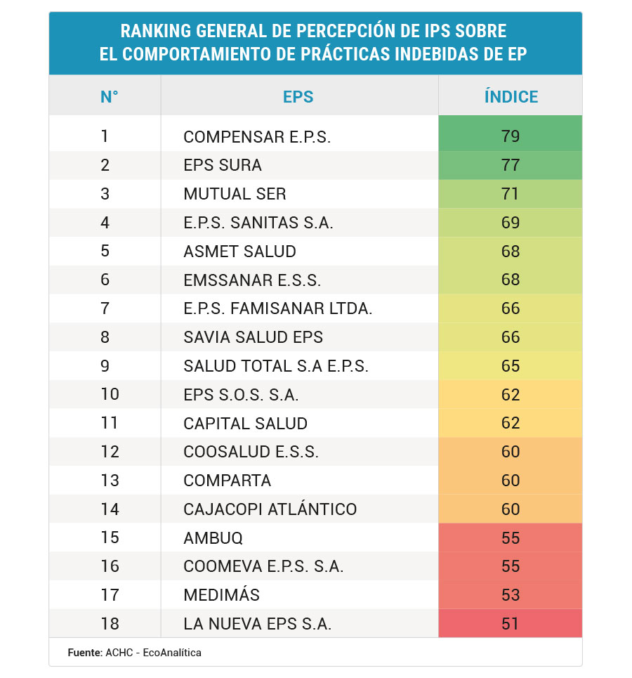 En una escala de 0 a 100, en el ranking general, las calificaciones más bajas fueron las de Nueva EPS (51), Medimás (53), Coomeva (55) y Ambuq (55) mientras que las EPS con mejor comportamiento fueron: Compensar EPS con (79), EPS Sura (77), Mutual Ser (71) y EPS Sanitas (69).