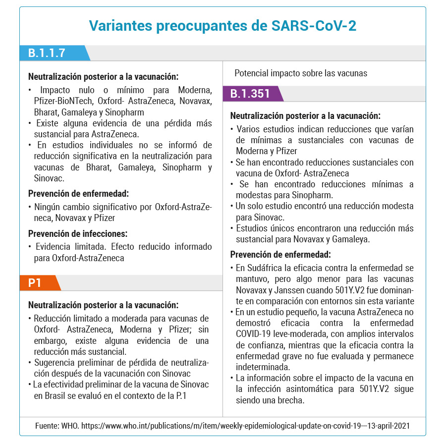La Organización Mundial de la Salud (OMS), en el documento “Epidemiological update on COVID-19”, describió la que hasta el momento es la información más relevante sobre las variantes consideradas como preocupantes del SARS-CoV-2, y su posible impacto sobre la vacunación.