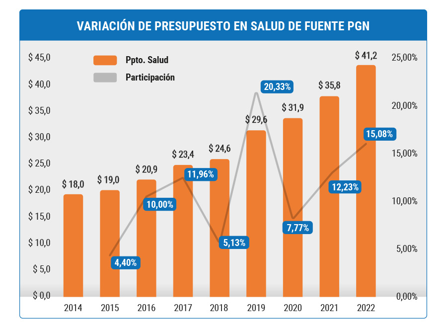 Mientras en 2016 de cada $100 del PGN ($215.9 billones), $10 fueron para la financiación del aseguramiento en salud de la población vulnerable ($20.9 billones), en 2019 fueron $20.33 ($258.9 billones de PGN y $29.6 billones presupuesto salud) y en 2021 de $12.33 ($314 billones PGN y Salud de $35.8 billones); para la vigencia de 2022 la participación será de $15.08 (PGN de $350.4 billones y Salud de $41.2 billones). Es decir que, en promedio los ingresos para la salud representan entre el 10 % y el 12 %, con especial crecimiento en los últimos años, pero que aún insuficiente para lograr equilibrio y la sostenibilidad del sistema en general.