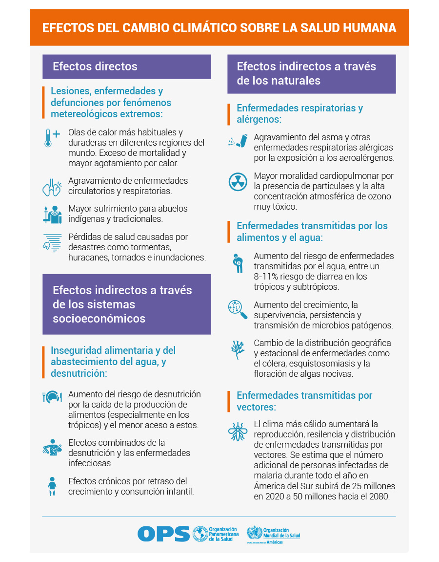 La Organización Panamericana de la Salud ha señalado de manera categórica que el cambio climático es la mayor amenaza para la salud mundial del siglo XXI. La afectación se dará a través de impactos directos como las olas de calor, sequías, tormentas fuertes y aumento del nivel del mar, e impactos indirectos como el aumento en las enfermedades de las vías respiratorias, las transmitidas por vectores, además de los efectos sobre otros determinantes que se traducen en inseguridad alimentaria, dificultad para el acceso a agua, desnutrición, e incluso, desplazamientos forzados.
