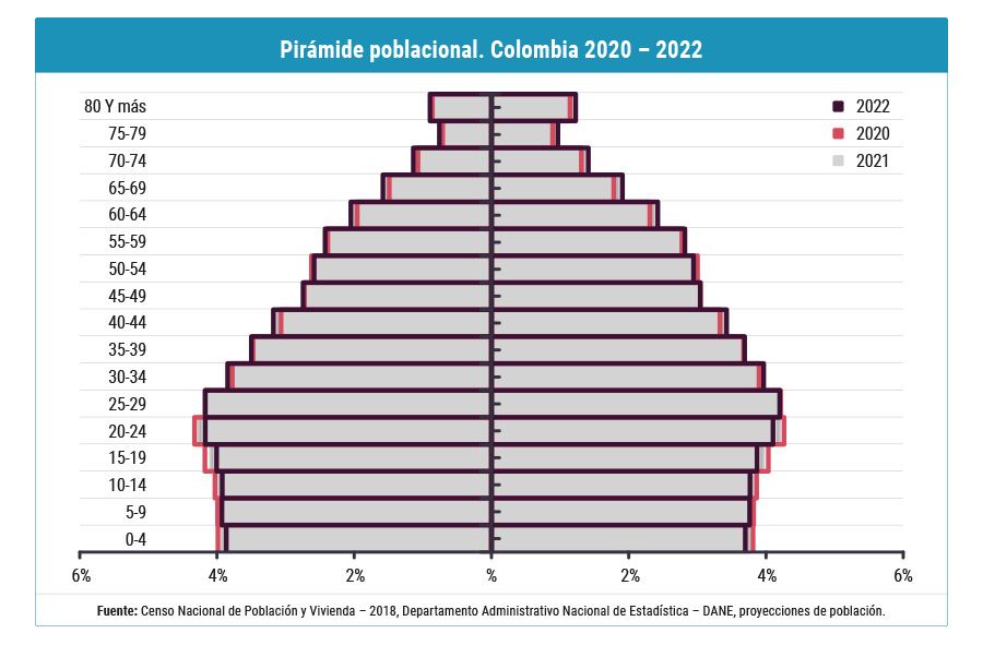Con una tasa de crecimiento promedio anual de la población de 1,33 (2015 - 2020 por cien habitantes), es en los aspectos demográficos donde se encuentran los primeros elementos interesantes de análisis. La pirámide poblacional continua ampliándose en su franja media y muestra una cierta tendencia hacia el aumento de la población mayor de los 80 años, lo que requerirá ajustes presupuestales en el sistema, pero también el fortalecimiento de los programas de promoción y prevención para reducir la carga de la enfermedad en las edades avanzadas.