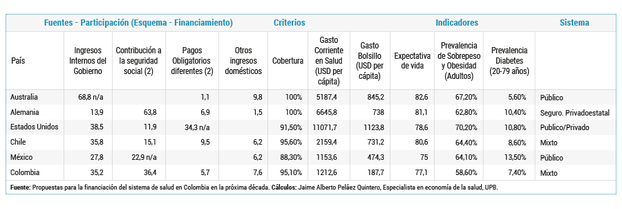 Colombia en particular presenta un modelo de previsión mixta con participación de los ingresos internos del gobierno con 35.2 %, lo mismo que de contribuciones a la seguridad social 36.4 % y de otros ingresos domésticos de 15.1 %, para un consolidado de 86.7 %. Este esquema de financiamiento garantiza una cobertura de aseguramiento del 95.1 %, para un gasto en salud de 1.212,6 USD per cápita y de Bolsillo de 181.7 USD. Las asignaciones presupuestarias han permitido una expectativa de vida de 77.1 años.