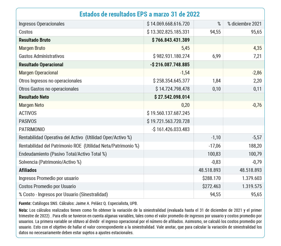 Un entendimiento particular se deriva del neto entre otros ingresos y otros gastos no operacionales que fue ampliamente positivo (mayores ingresos que gastos), habida cuenta que los primeros fueron de $258.355 millones y los otros ingresos operacionales de $14.725 millones, para un resultado neto de $27.542 millones y un margen neto de 0.20 %. O lo que es lo mismo, por cada $100 compensados al sistema, a las EPS en conjunto les quedó, 0.20 cvs, para distribuir excedentes, proyectos expansivos o reintegrarlos al flujo del capital de trabajo. A diciembre 31 de 2021 (todo el año) la pérdida fue de $510.529 millones y un margen neto de -0.76 %, es decir, contrario al resultado positivo de 2022, que puede ser un en primera instancia una muy buena noticia, toda vez que es el primer trimestre (en décadas) que presenta un valor comportamental positivo en el resultado neto.