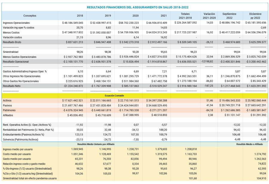 En los cinco años, las 32 EPS obtuvieron un total de $291.4 billones, (83,16 % del presupuesto total de ingresos en Colombia para 2022), con unos costos de una siniestralidad básica de 96,86 %, es decir, se cubren los costos, y se arroja un margen de 3,14 % para cubrir los gastos administrativos que por norma pueden ser del 8 % en régimen subsidiado y 10 % en régimen contributivo (art. 23 Ley 1438 de 2011).