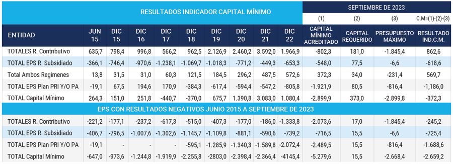 Hasta septiembre de 2023, la situación financiera de las EPS reflejaba un escenario preocupante, con un Capital Mínimo global negativo de -$372 300 millones, abarcando tanto el régimen contributivo como el subsidiado. Este deterioro afecta a las EPS autorizadas con ambos regímenes y aquellas en Planes de Reorganización Institucional y de Ajustes. En contraste con el agregado general de $264 300 millones en junio de 2015, este cambio a un valor negativo resalta el deterioro sectorial del aseguramiento en salud, generando inquietud por su proyección y consecuencias en toda la cadena de actores involucrados.