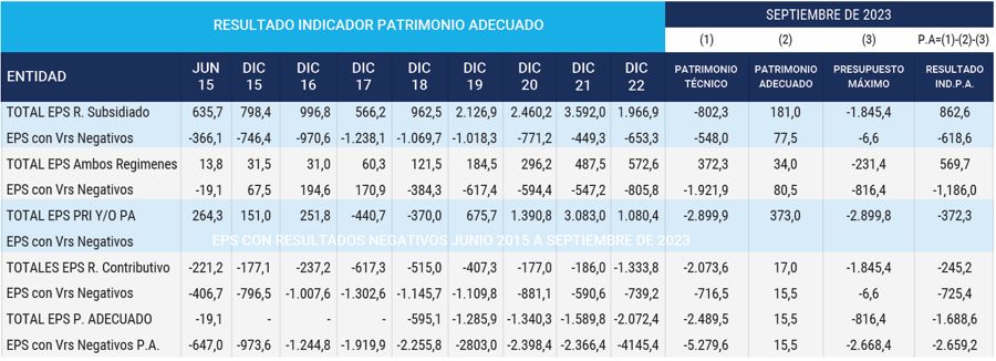 Las EPS del régimen contributivo acumulan un valor positivo de $862 600 millones hasta septiembre de 2023, mientras que aquellas que administran ambos regímenes reportan valores positivos por un total de $569 700 millones al cierre de este mes.