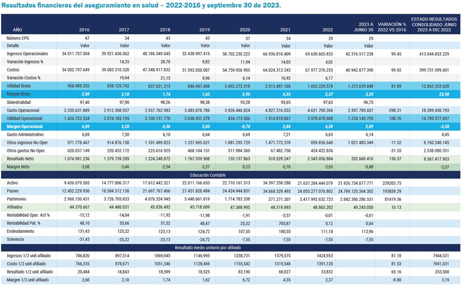 Fuente: Catálogos financieros (2016-2017-2018-2019-2020-2021-2022 y septiembre de 2023) SNS. Cálculos: Jaime Alberto Peláez Quintero, Especialista en gerencia, economía y finanzas en salud, UPB.