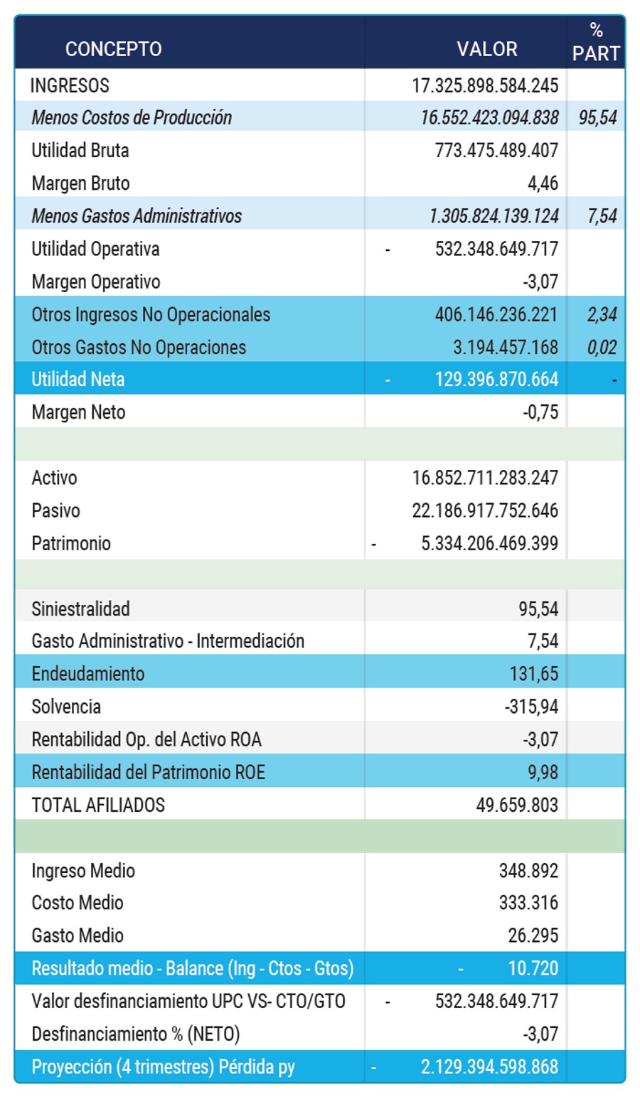 La insuficiencia se traduce en necesidad de capitalización, menor constitución de inversión de reservas técnicas, disminución en pago de cuentas por pagar y, obvio, en un aumento de pérdida y por tanto de deterioro patrimonial. En un ejercicio de establecer el costo medio de ingresos, costos y gastos y el respectivo balance final, según los valores totales, dividida la población total de afiliados en el régimen contributivo y subsidiado de 49 659 803. Según estos cálculos, se tiene que el ingreso medio a 31 de marzo de 2024 fue de $348 892, el costo medio de $333 316 y el gasto medio administrativo de $26 295, para un valor final medio de -$10 720.