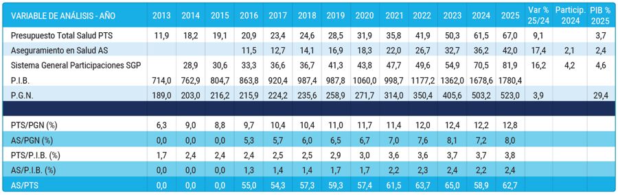 Para 2025, el presupuesto para la salud es el segundo más importante del PGN, con $67 billones, representando el 12,8 % del total y un 3,8 % del PIB, frente al 6,3 % en 2013. Este aumento del 9,1 % respecto a 2024, donde se asignaron $61.5 billones, supera la inflación estimada del 3,2 % para 2025.