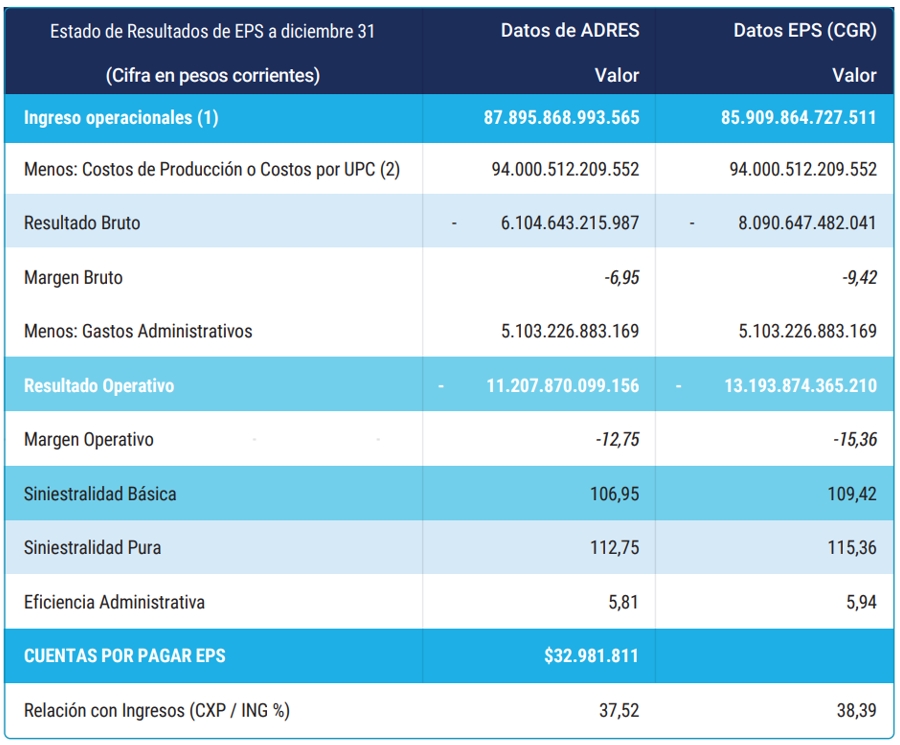 Siniestralidad: La media de siniestralidad de las 29 EPS estudiadas al 31 de diciembre de 2024 fue del 110,1 %, lo que indica que los gastos en atención rebasaron los ingresos operativos en un 10,1 %. La siniestralidad fluctuó entre el 87 % (EPS Cajacopi Atlántico) y el 131 % (EPS Ferrocarriles Nacionales). Esta desproporción muestra que los ingresos no son suficientes para afrontar el aumento del costo de los servicios sanitarios. La CGR señala tendencias estructurales como el aumento en la frecuencia de uso de servicios, el alza en los costos médicos y tecnológicos, la presión demográfica y epidemiológica, y la judicialización del derecho a la salud.
