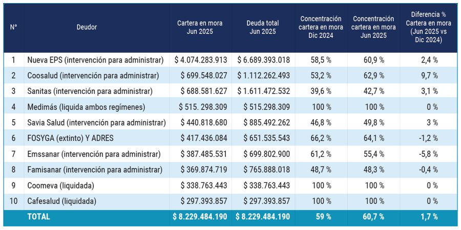 Pese a este panorama, algunas entidades como Aliansalud, Mutual Ser, Salud Mía y Sura mantienen concentraciones de mora inferiores al 26 %, un desempeño mejor que el promedio nacional.