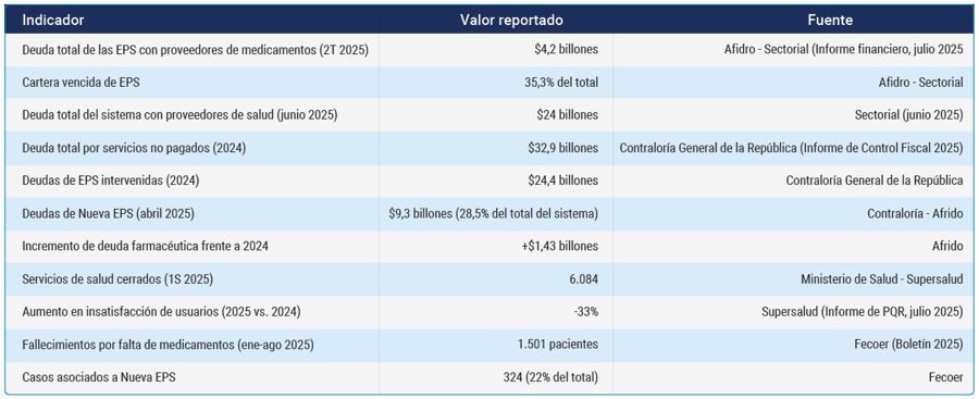 Un caso importante es el de Nueva EPS, que para abril de 2025 tenía obligaciones por $9.3 billones, lo que representaba el 28,5 % de la deuda total del sistema. Según la Contraloría General de la República, durante el período comprendido entre enero y diciembre de 2024, los servicios no pagados acumulados ascendieron a $32.9 billones; $24.4 billones de esta suma pertenecían a EPS bajo intervención.
