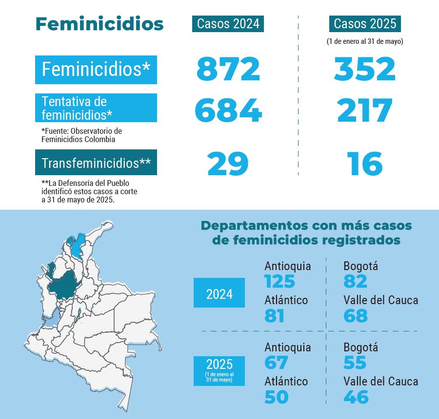La Defensoría del Pueblo reportó que cada año son asesinadas cerca de 1.000 mujeres en Colombia, lo que equivale aproximadamente a una cada ocho horas. A nivel nacional, se registra un promedio anual de 139 homicidios de personas con orientación sexual e identidad de género no hegemónica.