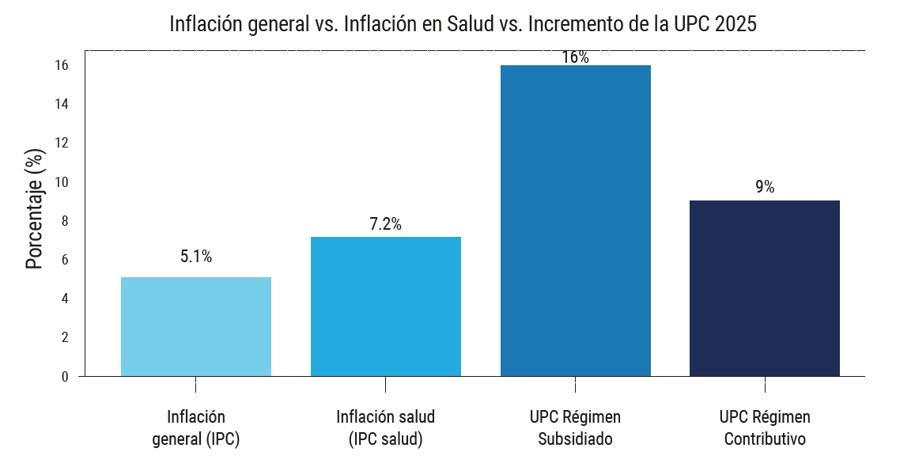 “Frente a la inflación —explica—, observamos cómo el IPC para 2025 fue de 5,1 % y el IPC especializado en salud fue de 7,2 %, comparado con el incremento de la UPC del 16 % para el régimen subsidiado y de un poco más del 9 % para el contributivo”.