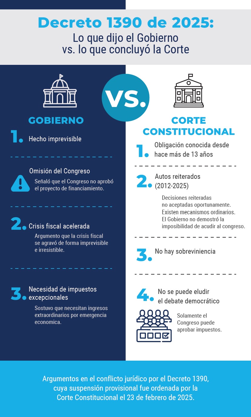 Para Lisandro Junco Riveira, jurista y funcionario público especializado en derecho tributario y financiero, “el acceso a financiamiento, aunque costoso (reflejado en spreads elevados), permanece disponible, lo que contradice la alegada ‘inminencia’ del colapso fiscal”. Agregó que, aunque el decreto invoca posibles “riesgos a derechos fundamentales”, estos son “potenciales y remotos, no presentes e inmediatos”, y que el “acceso de población vulnerable a servicios de salud, educación e infraestructura permanece, aunque con limitaciones, disponible”, como se evidencia en el Auto RE-387 de la Sala Plena de la Corte Constitucional (2026).