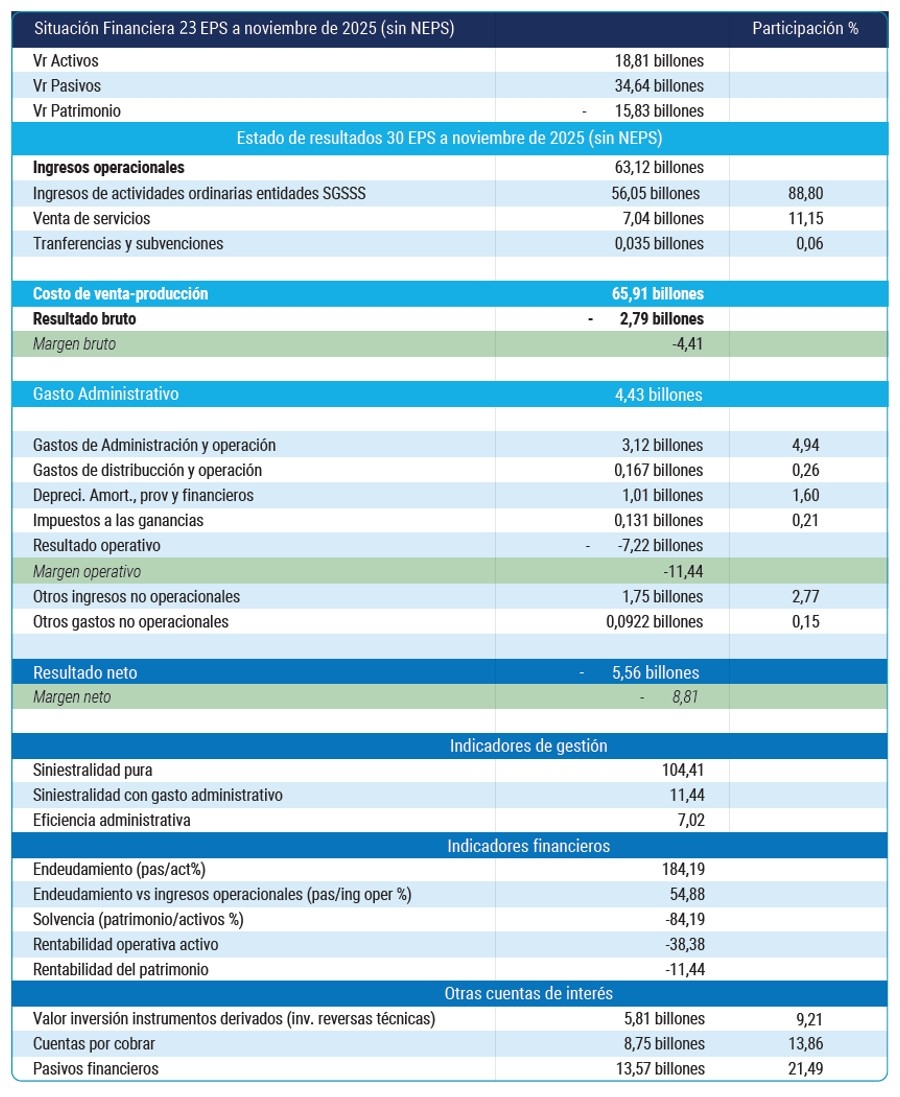 Los estados financieros consolidados de 30 EPS (sin incluir a Nueva EPS) evidencian un quebranto estructural del modelo de aseguramiento. A noviembre de 2025, el sistema registra un patrimonio negativo de –$15.8 billones, con una proyección de –$17.3 billones al cierre del año, y un endeudamiento del 184 %, lo que implica una insolvencia técnica generalizada. Los ingresos por UPC y otras fuentes ($63.1 billones) resultan insuficientes frente a un costo técnico de $65.9 billones, lo que genera un déficit bruto de –$2.79 billones y confirma un desbalance estructural entre ingresos y costo médico.
