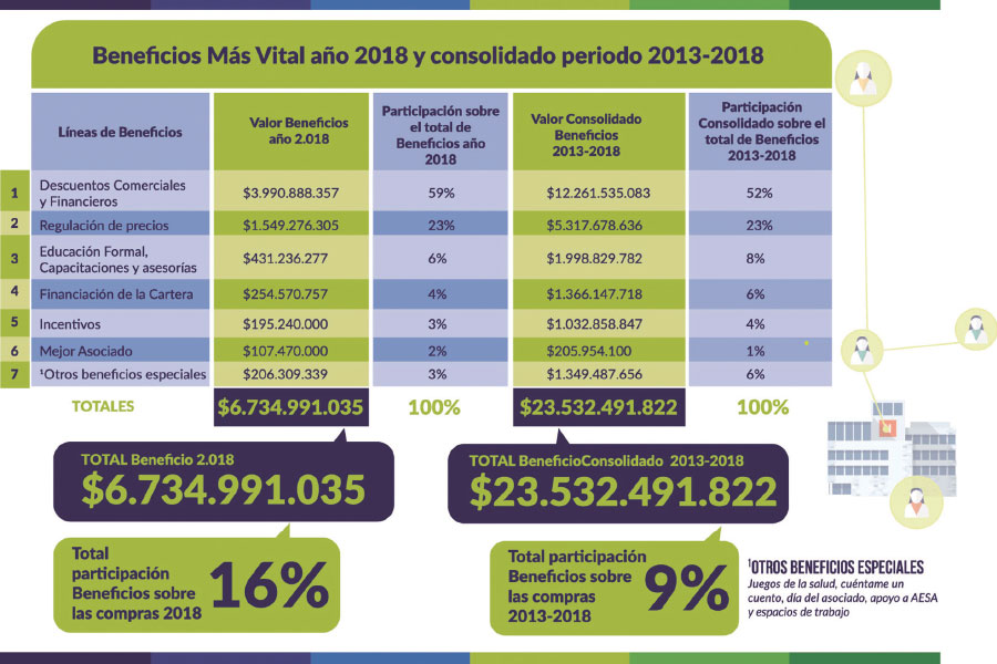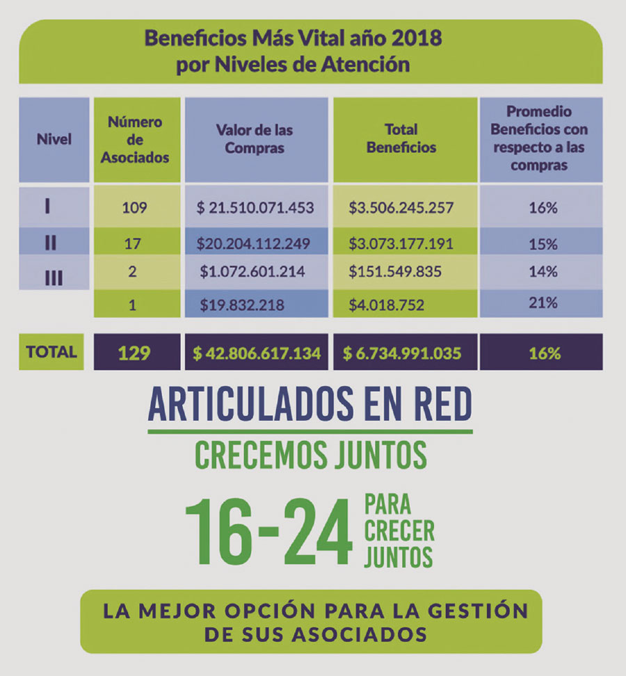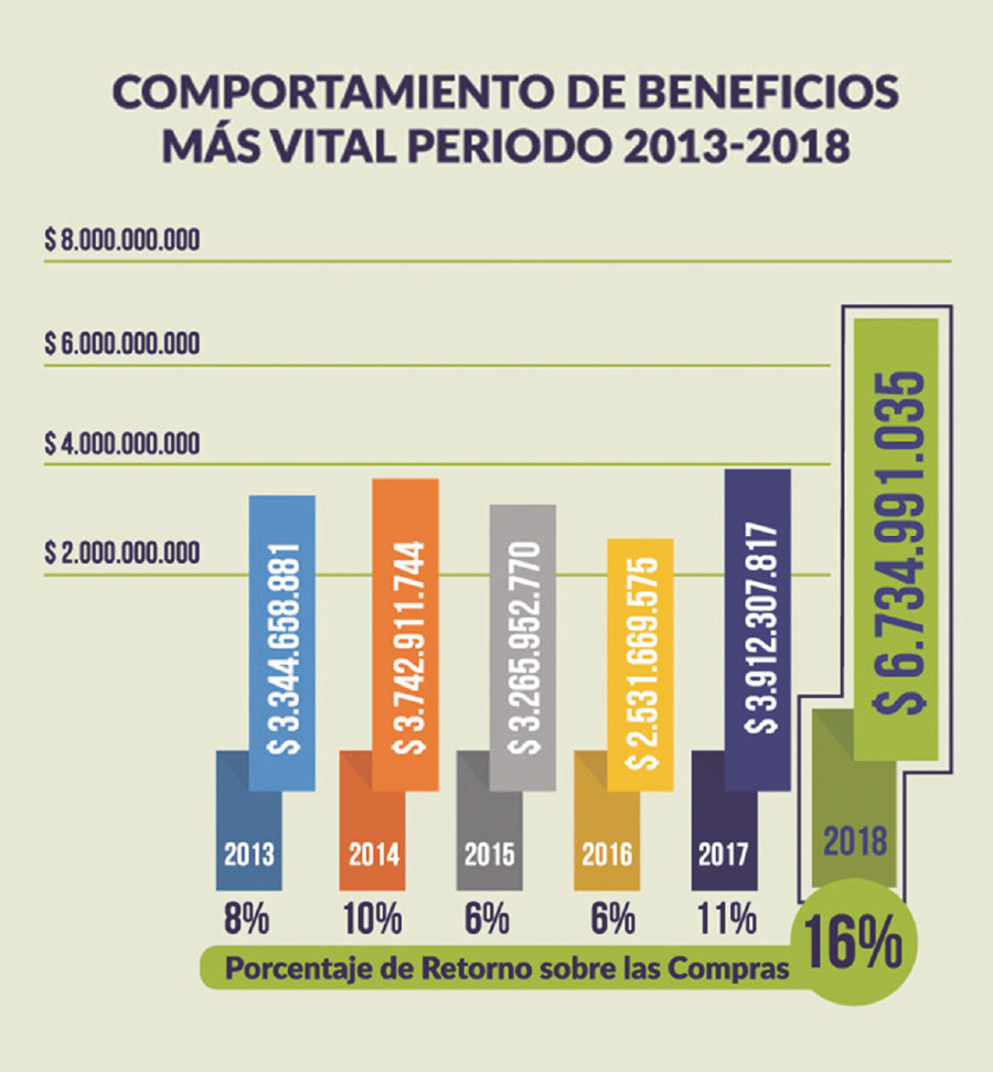 La demostración de los efectos positivos que trae para el sector hospitalario trabajar de manera cooperativa, aunado con una gestión transparente y progresista, son los resultados del programa “Beneficios Más Vital”, por medio del cual la Cooperativa entregó a sus instituciones asociadas cerca de $6.734 millones de pesos durante el año 2018, y más de $23.500 millones de pesos durante el periodo 2013-2018, representados en los diferentes lineas del programa.