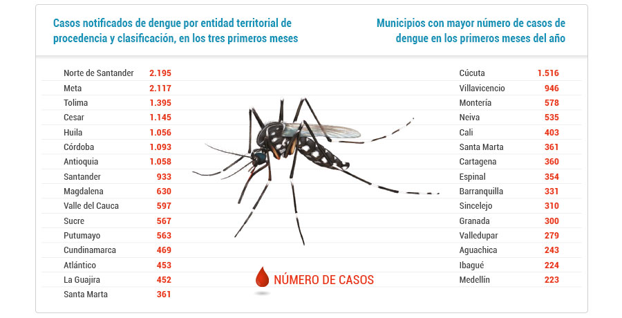 Según el subdirector del programa Enfermedades Transmisibles del Ministerio de Salud, José Fernando Valderrama, en Colombia ya se registraron 17.000 casos y este aumento se debe en gran medida a los malos hábitos de la ciudadanía y el fenómeno de El Niño, que obliga a las personas a almacenar agua, lo que ha permitido el aumento de los vectores y la multiplicación de los zancudos, por eso se hace necesario el buen manejo de depósitos de agua y evitar lugares donde se pueden formar charcos, situaciones que pueden evitar la reproducción del Aedes Aegypti.