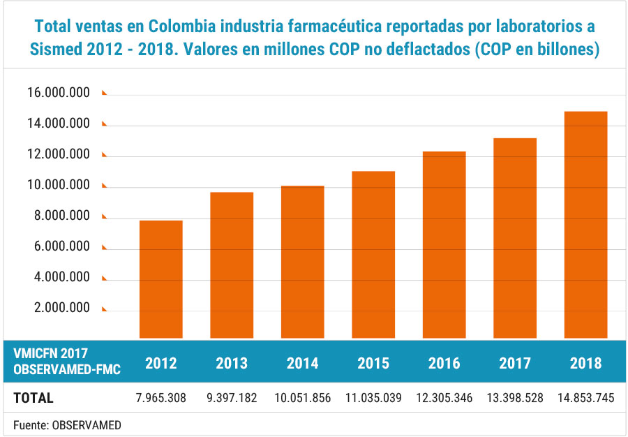Las ventas totales de la industria farmacéutica en Colombia en estos siete años (2012 -2018), ascendieron a $78 billones, que equivale proporcionalmente a 1.16 veces el gasto total en salud en Colombia de 2018, toda vez que según las estimaciones con un PIB de $983 billones proyectado, y un porcentaje de gasto total en salud del 6.8% anual, se tendría un gasto preliminar teórico de $67 billones. Este resultado es muy relevante, toda vez que permite observar el peso real que tiene la adquisición de medicamentos y dispositivos médicos como componente de los cuatro submercados que constituyen el mercado de la salud. Este gasto supera una quinta parte del total del gasto en salud, de ahí que cualquier decisión que se adelante en el análisis del sector debe consultar la participación de este concepto en el agregado general, especialmente en unas ventas que cada vez crecen por encima de la inflación o de la tasa de interés real, el salario mínimo y el mismo PIB.